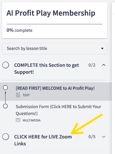 Once you open the course, look for the section labeled Click Here for Live Zoom Links and CLICK it to open. The individual LIVE call pages will appear once it has been clicked, as the section does not open automatically.
