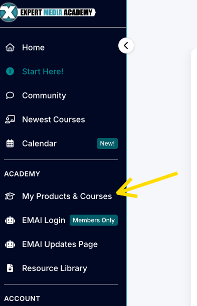 Look at the left-hand menu and click My Products & Courses under ACADEMY.